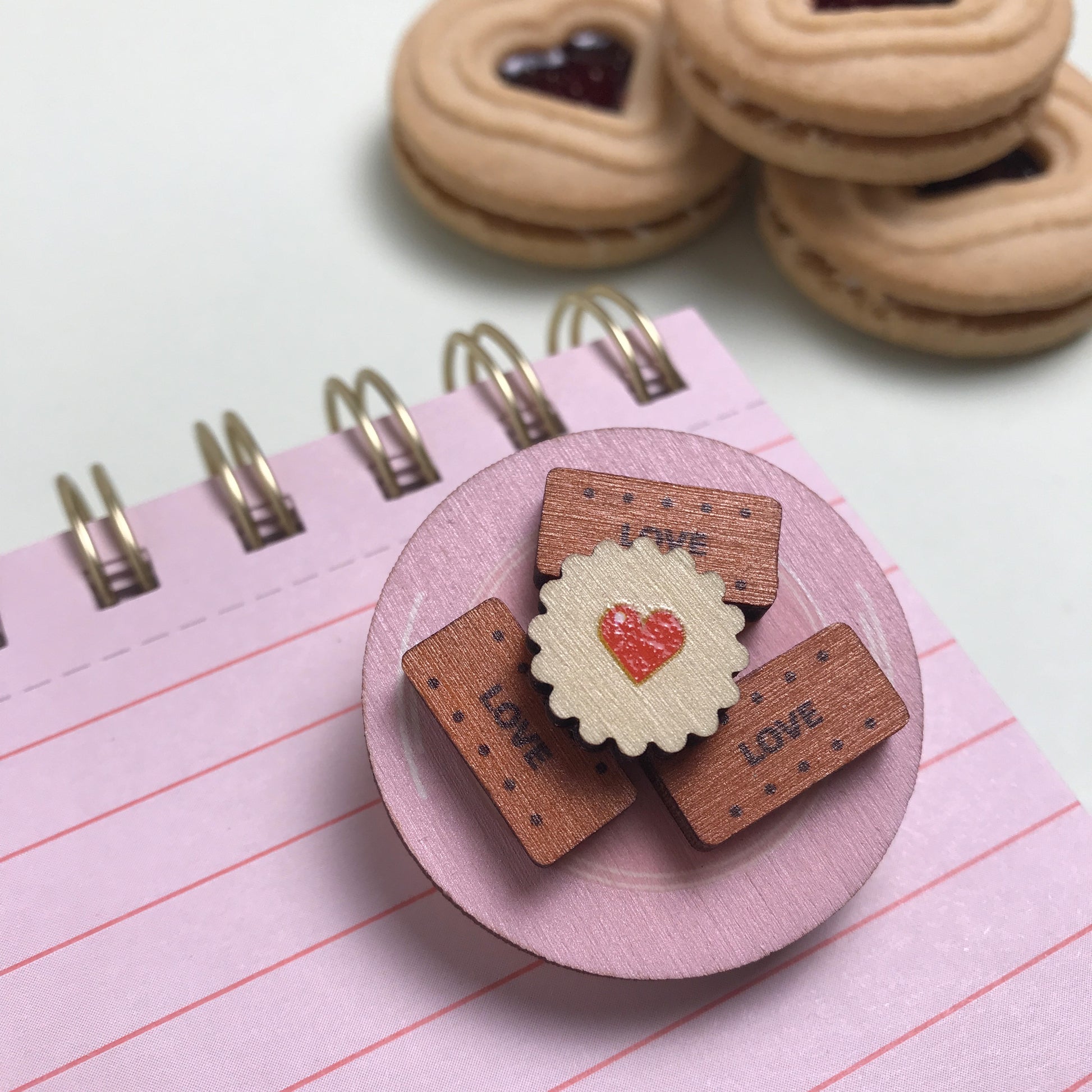 This brooch features three miniature bourbons, each with love printed on them. Sitting proudly on top of them is a jam heart biscuit. This has a glossy red heart in the centre. Choose a pastel pink or pale teal plate to make it your own.