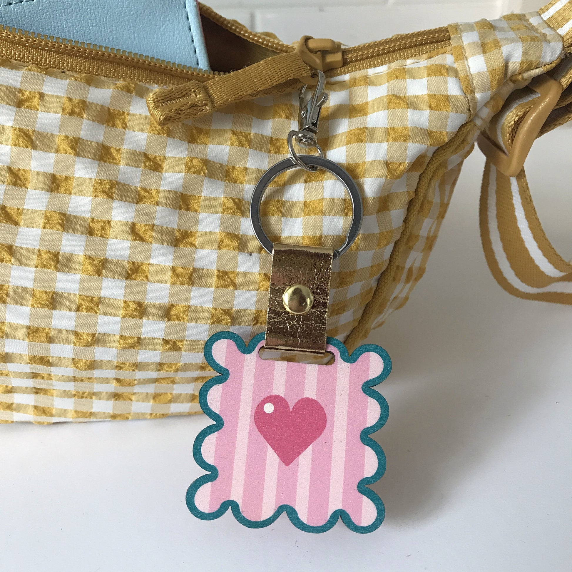 This is a super cute wooden keyring or bag charm. Carefully cut to order with a delicate wavy frame shape. The outer frame is a deep teal filled with a pretty pink and white stripe. In the centre is a sweet hot pink heart. On the back the background is the same as the front of the keyring but instead of the heart there is space left for your own short message (max 6 words). Each keyring/bag charm is made to order and finished with a faux leather gold band, metal keyring and bag charm clasp.