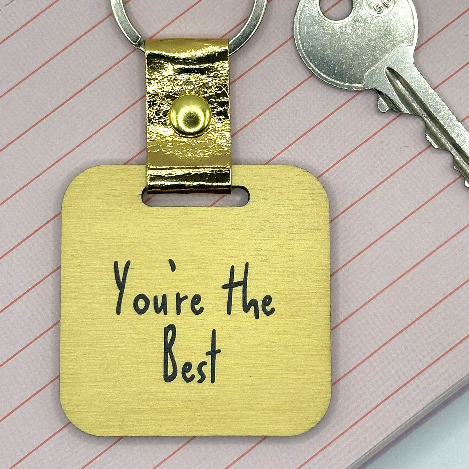 The main part of the keyring is made from wood and is finished with a high quality UV print. Each keyring has a strong gold, faux leather band and a metal keyring. It is supplied on a colourful backing card.