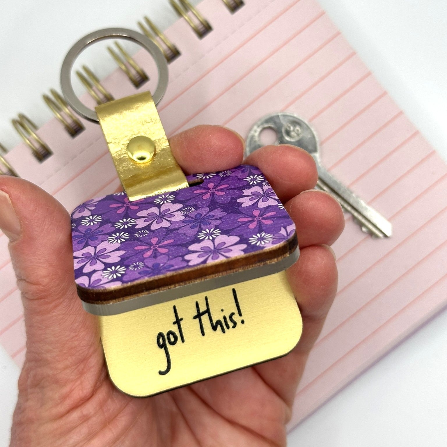 This floral wooden keyring is carefully printed with a purple primula flower design. The pattern is designed in a 70’s inspired style. Primula’s are the flower for a February birthday. On the back is printed a choice of uplifting message.