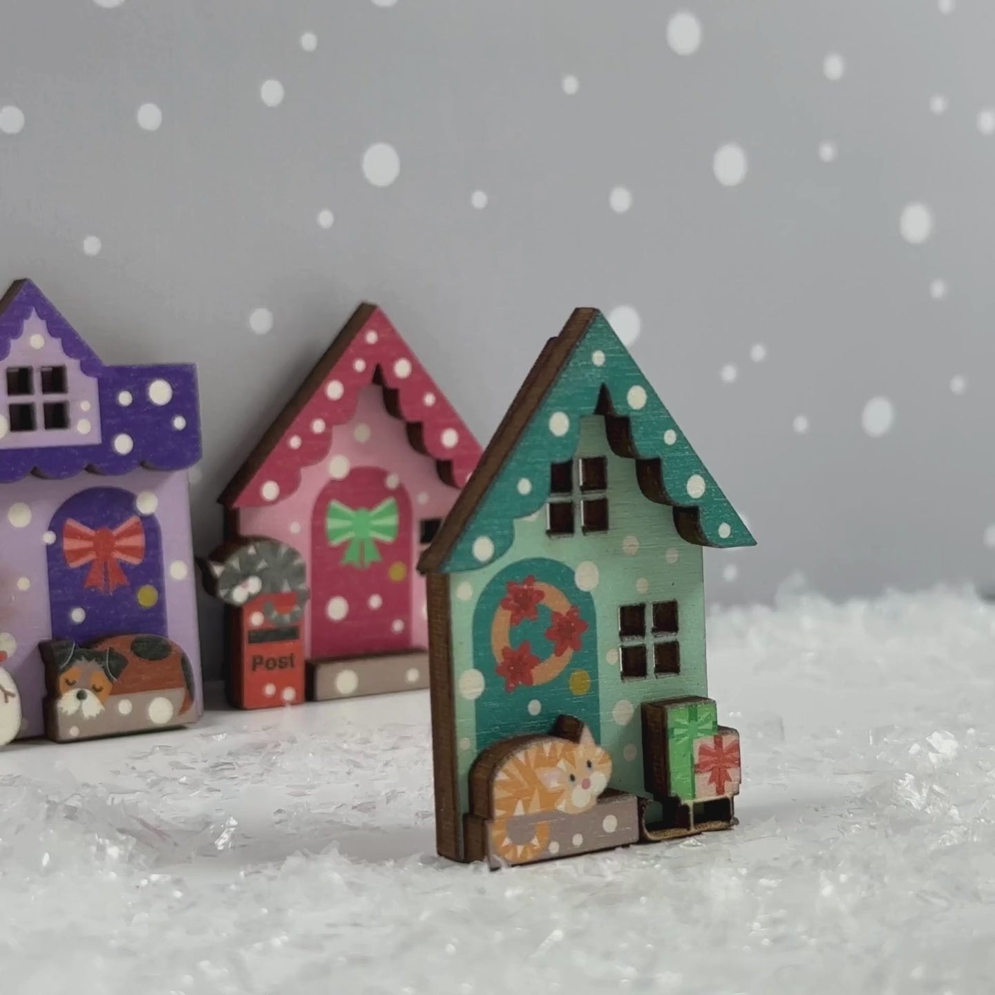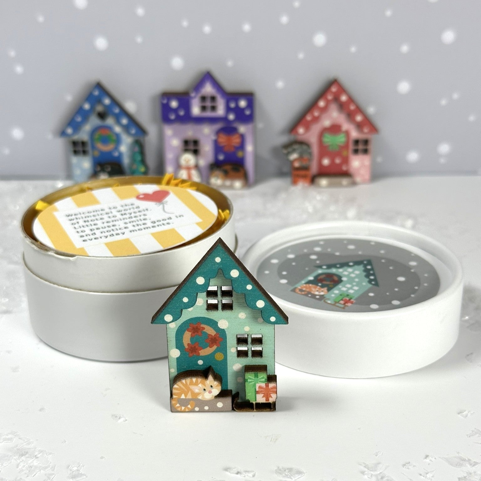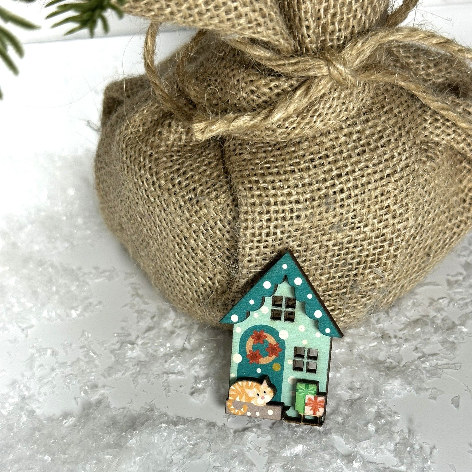 Green Winter Cottage Wooden Pin. Delightful Winter Accessory