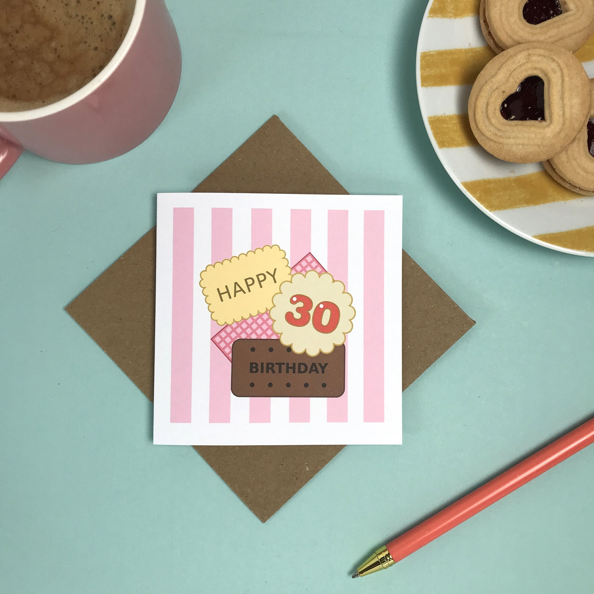 This card with a delightful pink and white striped background features a joyful line up of tea time favourite biscuits. A nice biscuit printed with Happy, a Bourbon with Birthday, a pink wafer peeking behind and a jam heart biscuit with red 30. A quietly cheerful way to celebrate three brilliant decades.