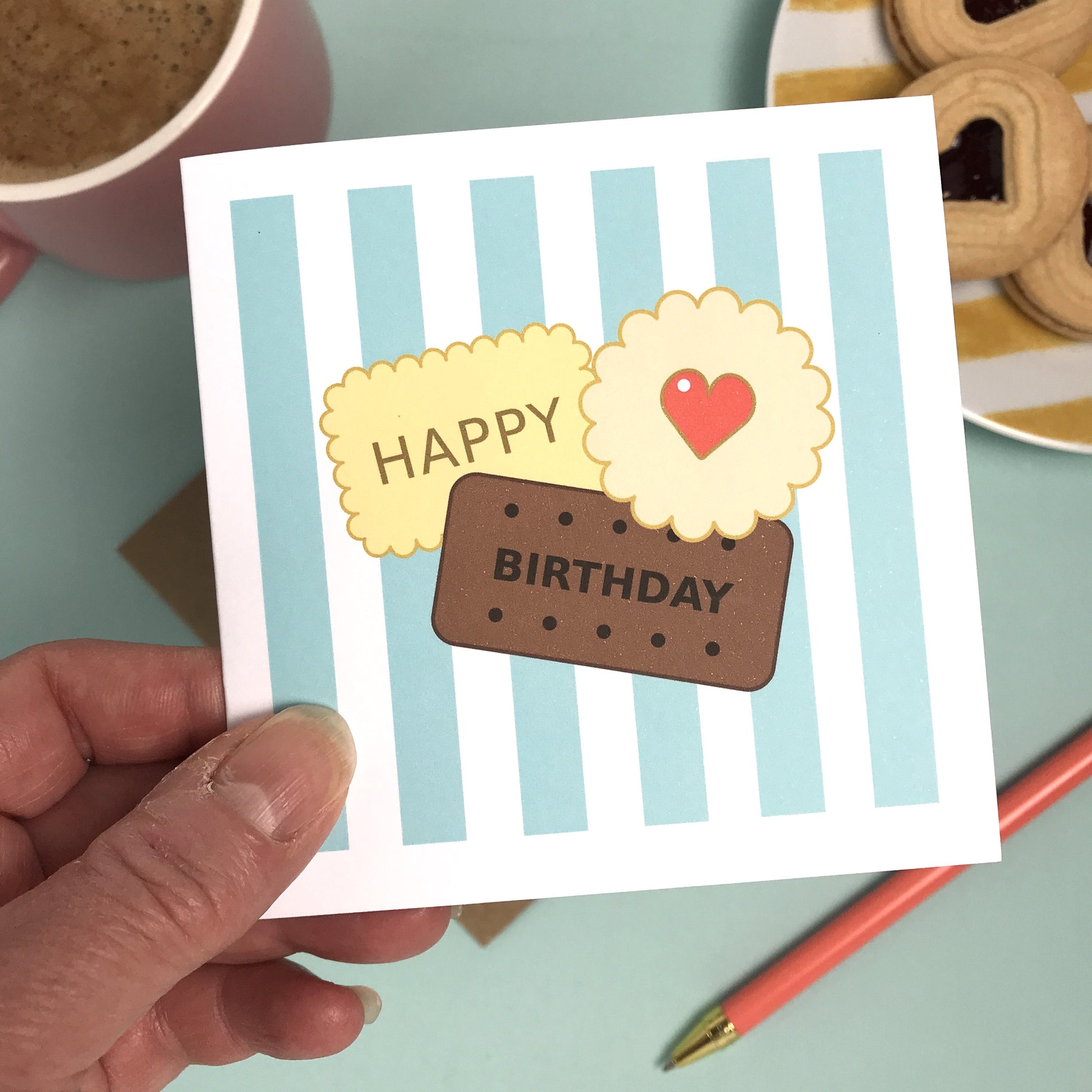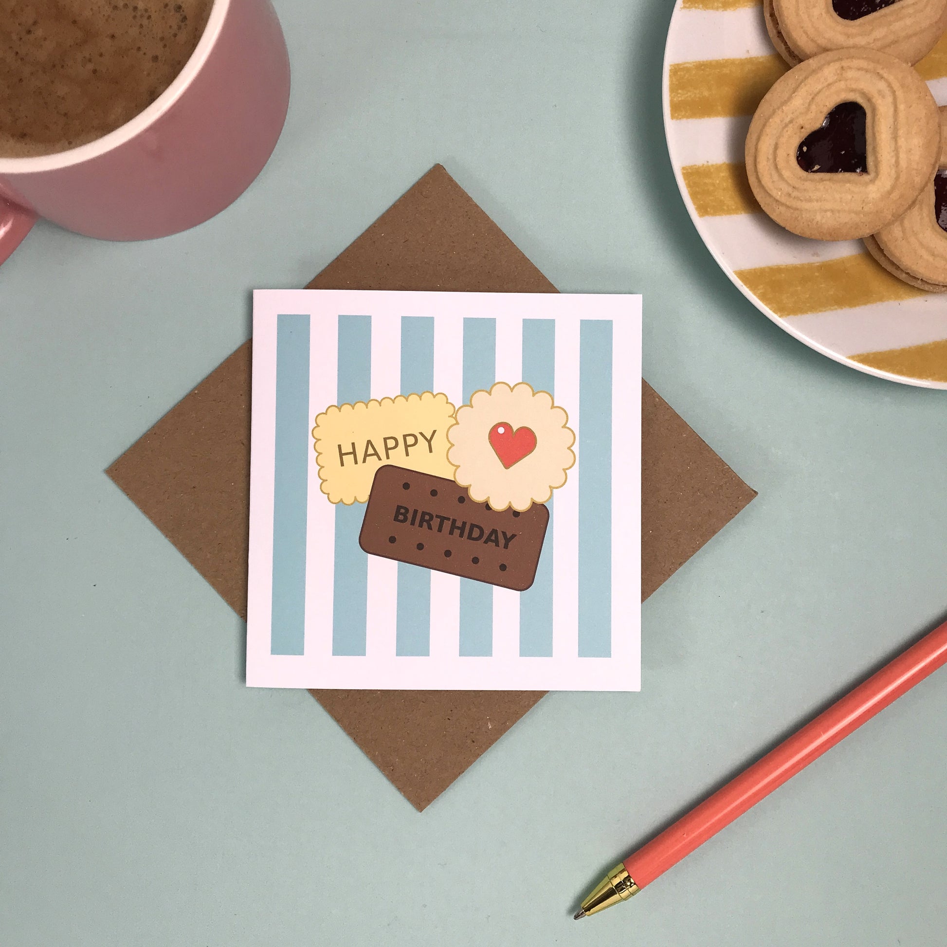 This nostalgic card shows three charming biscuits favourites. A nice biscuit printed with Happy, a bourbon with Birthday, and a jam heart biscuit. All set on a pastel teal green and white striped background. A cool, colourful way to send birthday cheer.