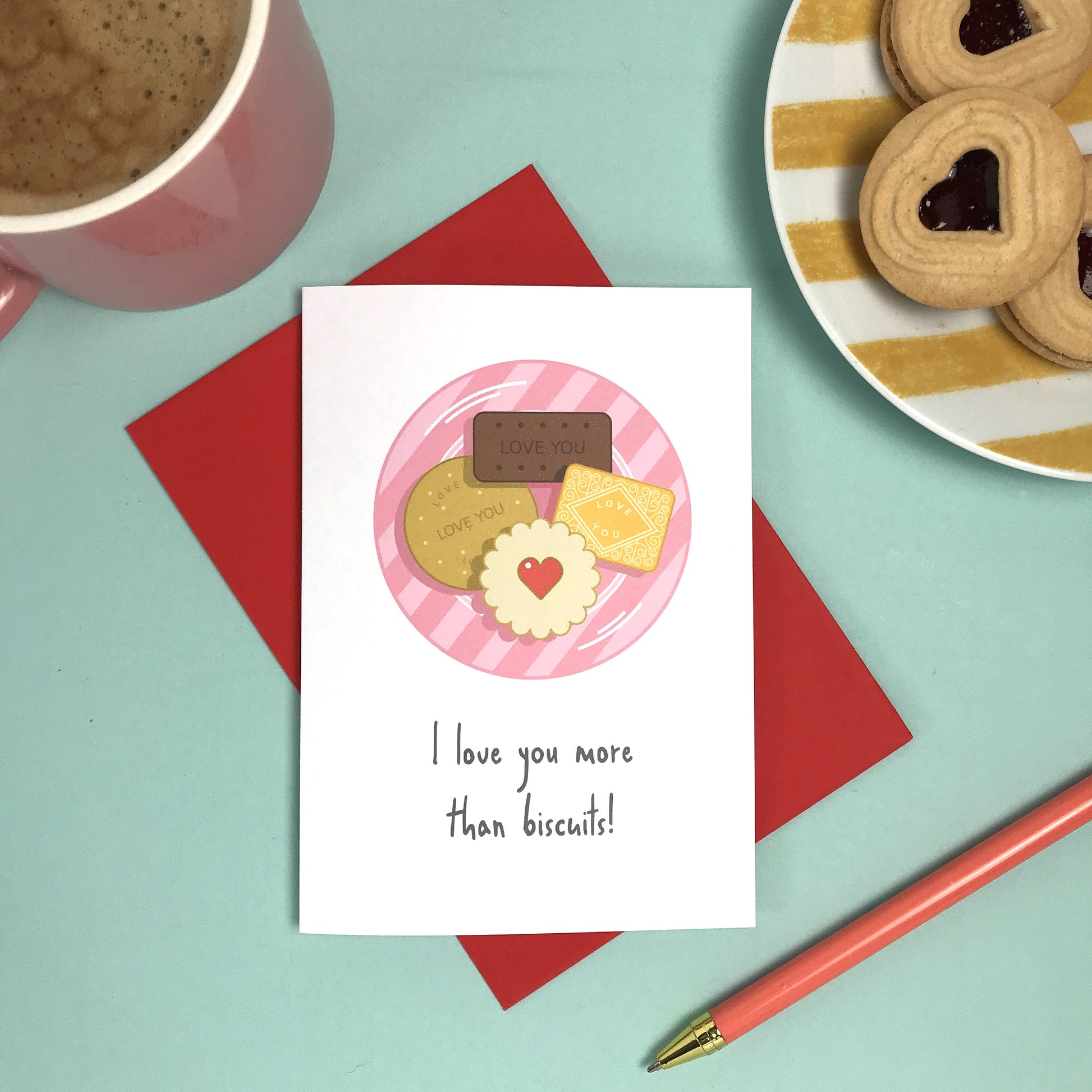 This cheerful A6 card is perfect for someone you love more than biscuits (and that’s saying something). On the front, a plate of tea time favourite biscuits. A bourbon, custard cream and digestive. Each one printed with the words “Love you”. Topped off with a jam heart biscuit, because love should always come with a sweet centre.