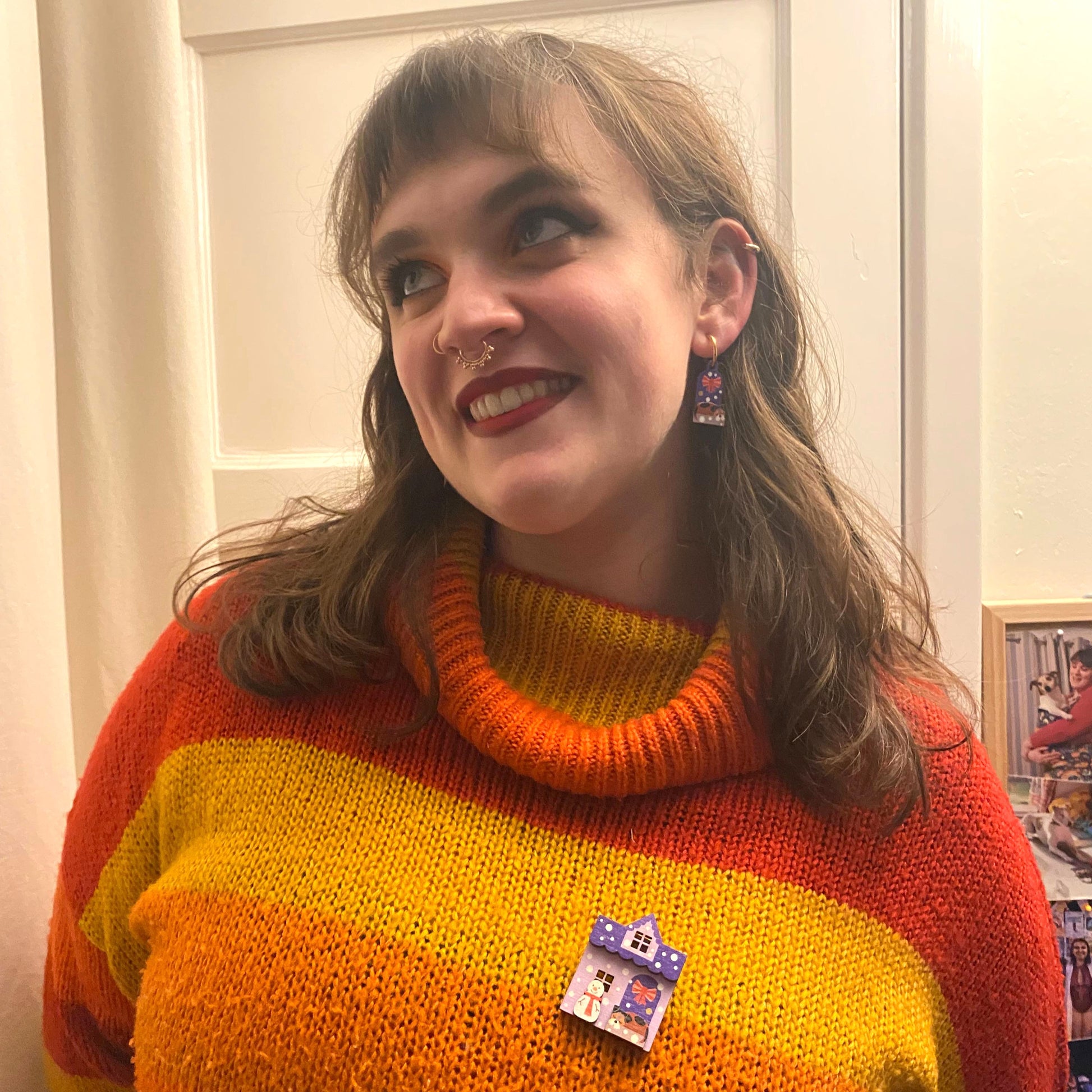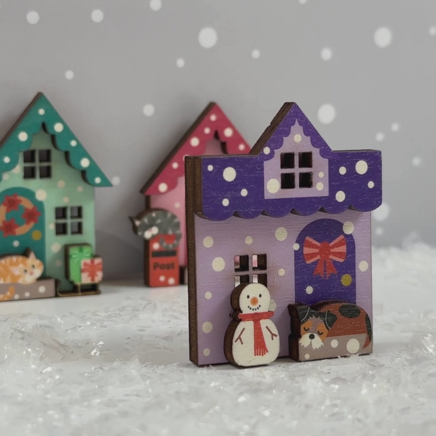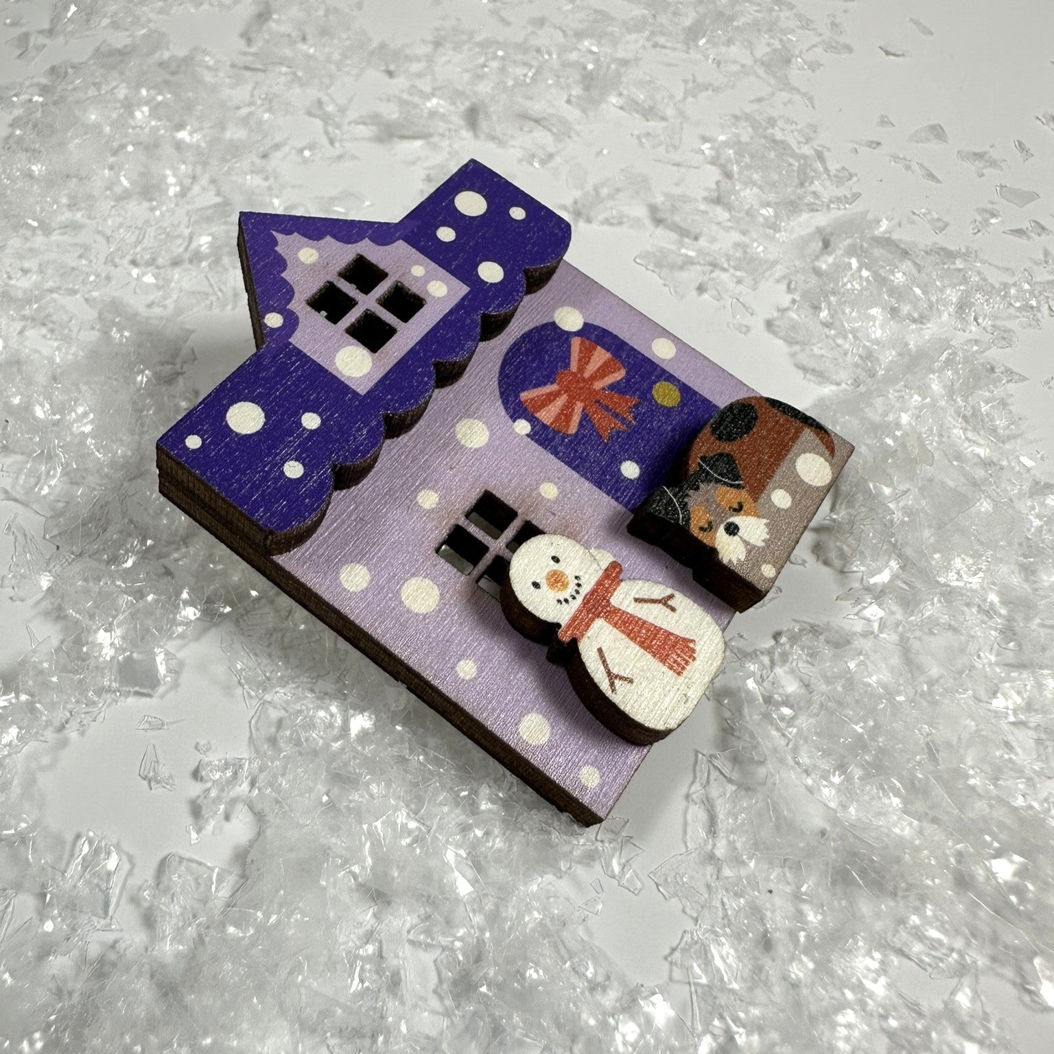 Festive Purple Wooden House Brooch. Perfect Winter Accessory