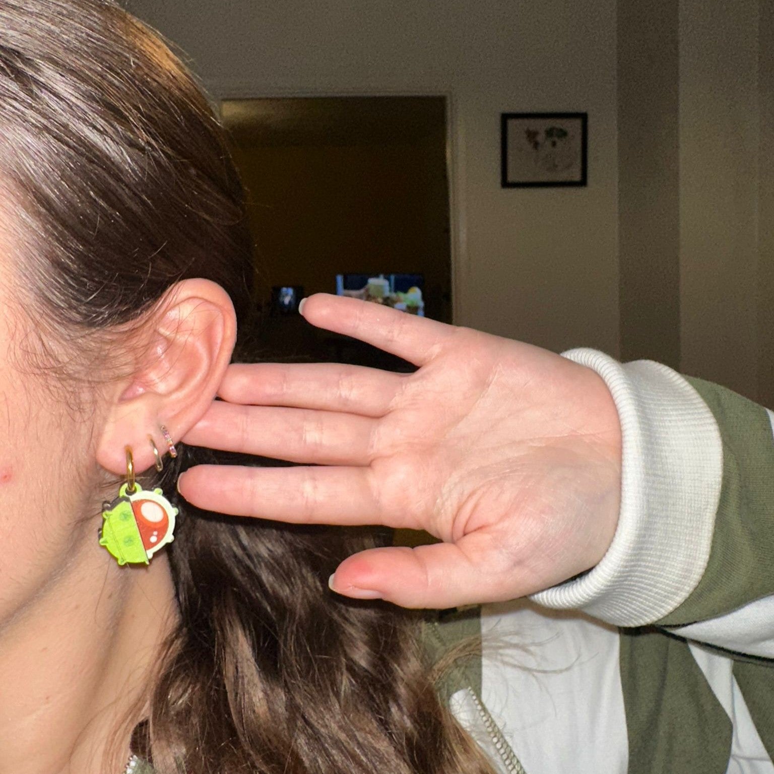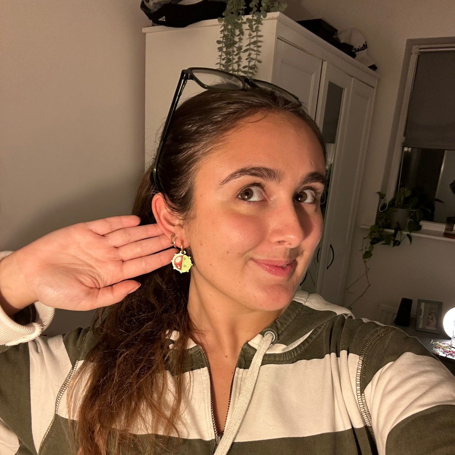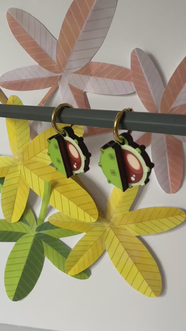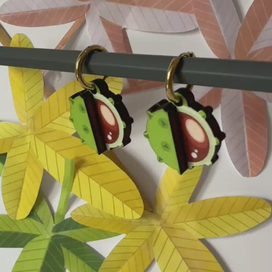 Bring a little autumn magic to your day with these cheerful conker earrings. Each pair is made from lightweight wood, and printed with high quality UV printing and a glossy highlight for the conker. They are finished with gold-plated stainless steel huggy hoops, they’re colourful, comfy, and full of character.
