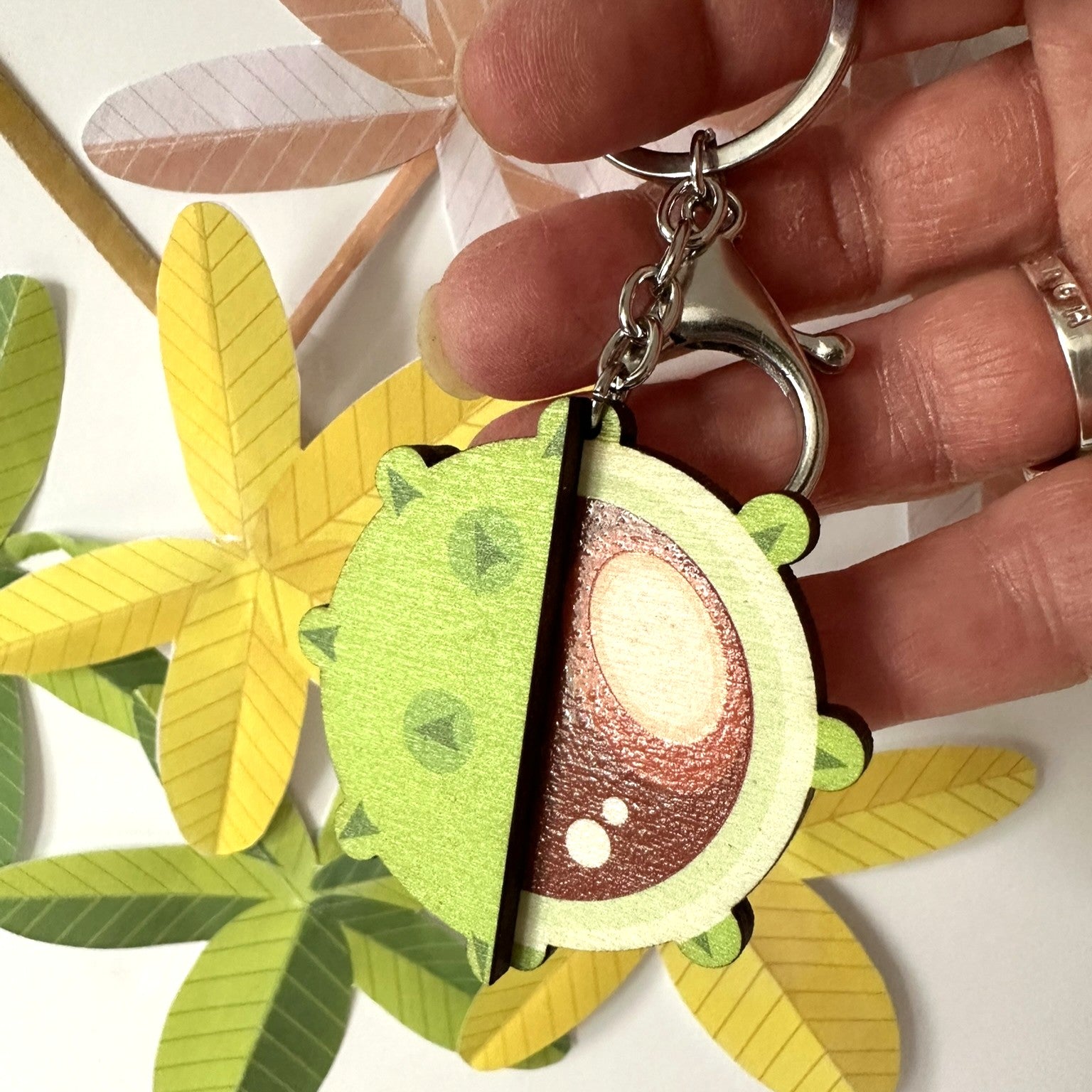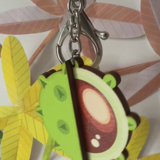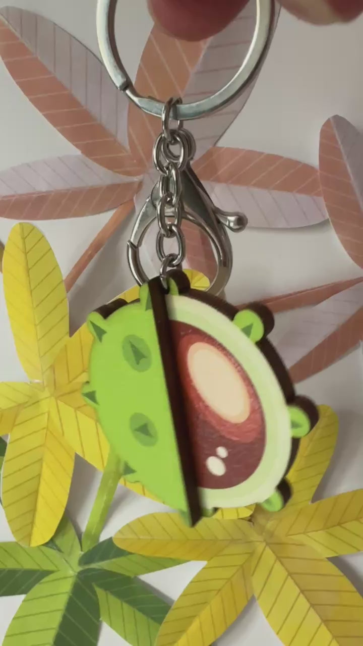 Carry a little autumn with you wherever you go. This wooden conker keychain features a beautiful wooden conker in its shell. It is printed with high quality UV ink with the conker picked out in a high gloss finish. This keyring is full of rich colour and seasonal charm. Each one is lightweight, smooth to the touch. It is made from sustainable sources wood and finished with a metal keyring and lobster clasp.